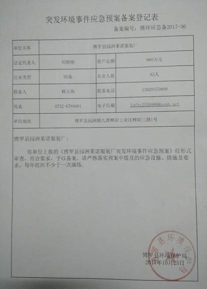 突發(fā)環(huán)境事件應(yīng)急預(yù)案    已制訂《博羅縣園洲萊諾服裝廠突發(fā)環(huán)境事件應(yīng)急預(yù)案》,并于2017年 10月25日在博羅縣環(huán)境保護局備案,